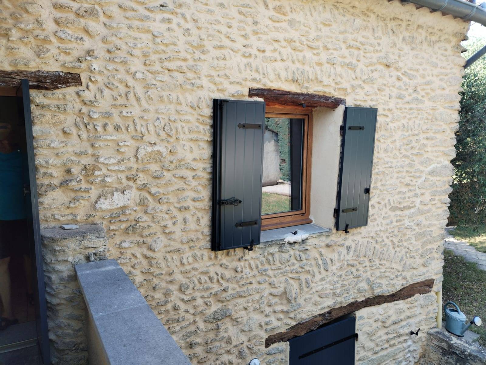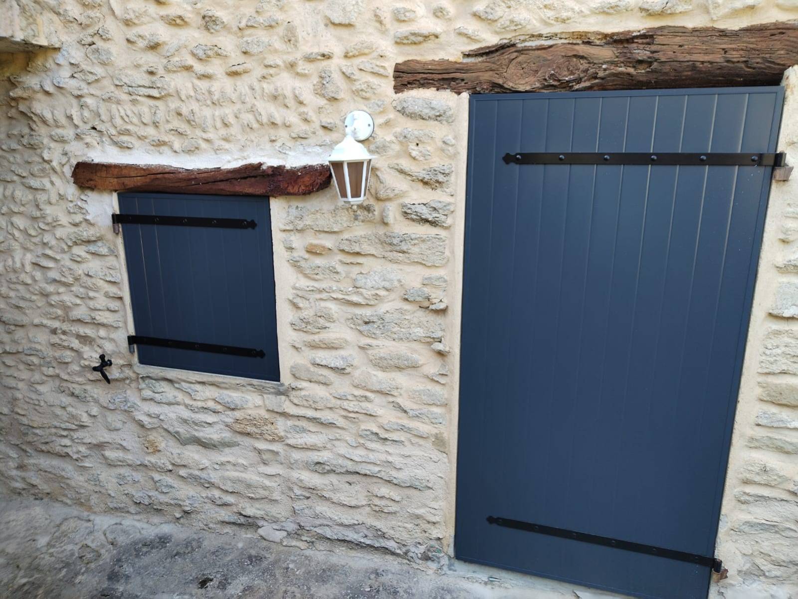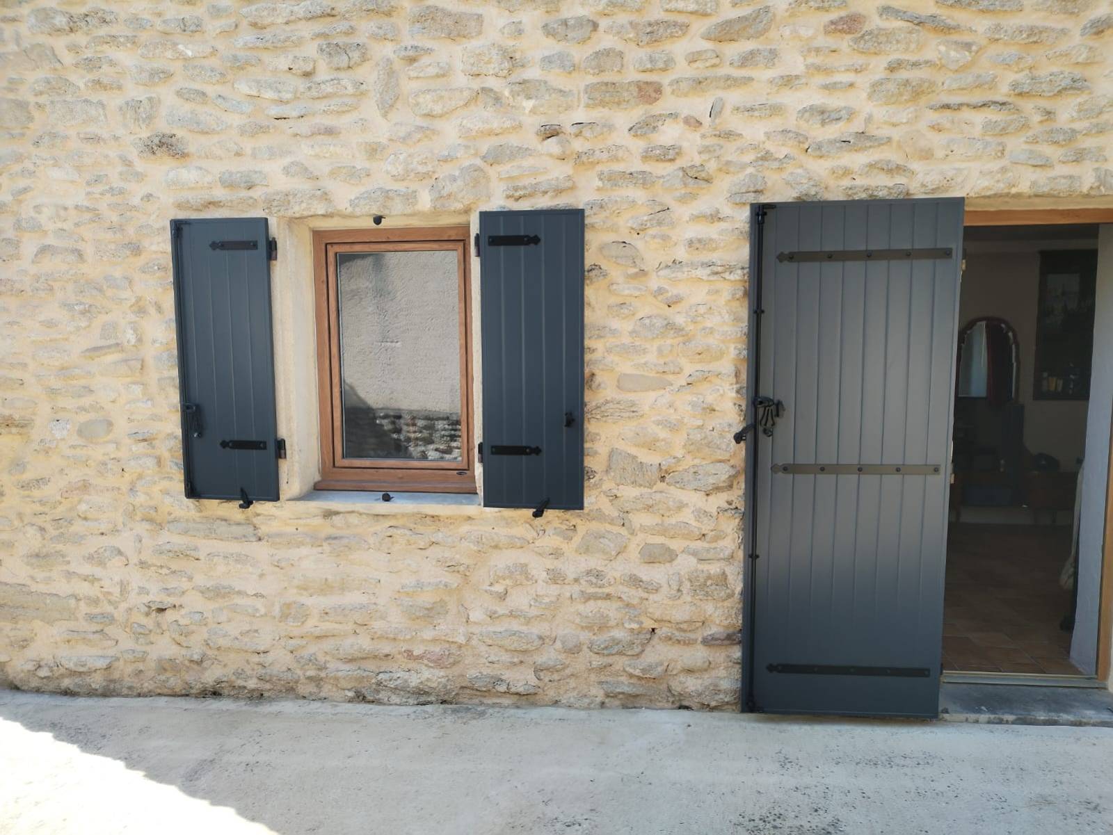 Les volets installés à Entrechaux sont des modèles battants en aluminium thermolaqué gris anthracite (RAL 7016), choisis pour leur résistance aux intempéries et leur parfaite tenue des couleurs dans le temps. Fabriqués sur mesure par Atlantem, ils s’adaptent précisément aux dimensions des ouvertures existantes du mas, sans nécessiter de modification de la maçonnerie. L’aluminium, matériau léger mais ultra-résistant, est ici renforcé par une isolation interne pour améliorer les performances thermiques de l’habitation. Les volets sont également équipés de pentures et contre-pentures en aluminium assorties, pour un rendu esthétique uniforme et discret. Ce chantier a été mené dans le respect du bâti ancien : les fixations sont invisibles et les formes d’encadrement conservent le cachet d’origine. Le système de fermeture multipoints offre une sécurité renforcée, tout en assurant une manipulation fluide au quotidien, même pour de grandes dimensions.